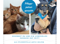 Wir suchen Menschen, die uns einen Pflegeplatz anbieten für Hunde und Katzen. Optimalerweise sind das Plätze, die ein Tier bis zur Vermittlung zu sich nehmen. Die Grundausstattung für das Tier, also Kratzbäume, Katzentoilette und natürlich auch alles rund um den Hund erhalten Sie vom Verein. Futter und Tierarztkosten werden ebenfalls vom Verein getragen. Sie können frei entscheiden, ob sie ein Tier in Pflege nehmen. Natürlich ist es auch möglich, ein Tier, wenn es perfekt zu Ihnen passt und alle Formalitäten geklärt sind, für immer zu übernehmen.