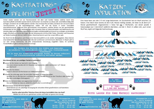 Die Anzahl der Pflegestellen entscheidet maßgabelich darüber wievielen Tieren wir helfen können. Aufgrund vieler Tierabgaben suchen wir dringend neue Pflegestelle. Sie wollen helfen? Dann melden Sie sich gerne bei uns. Entweder per Email oder telefonisch unter 089 70 95 07 32 (Mo/Di 15:00 - 18:00 Uhr oder Do/Fr 17:00 - 20:00 Uhr).