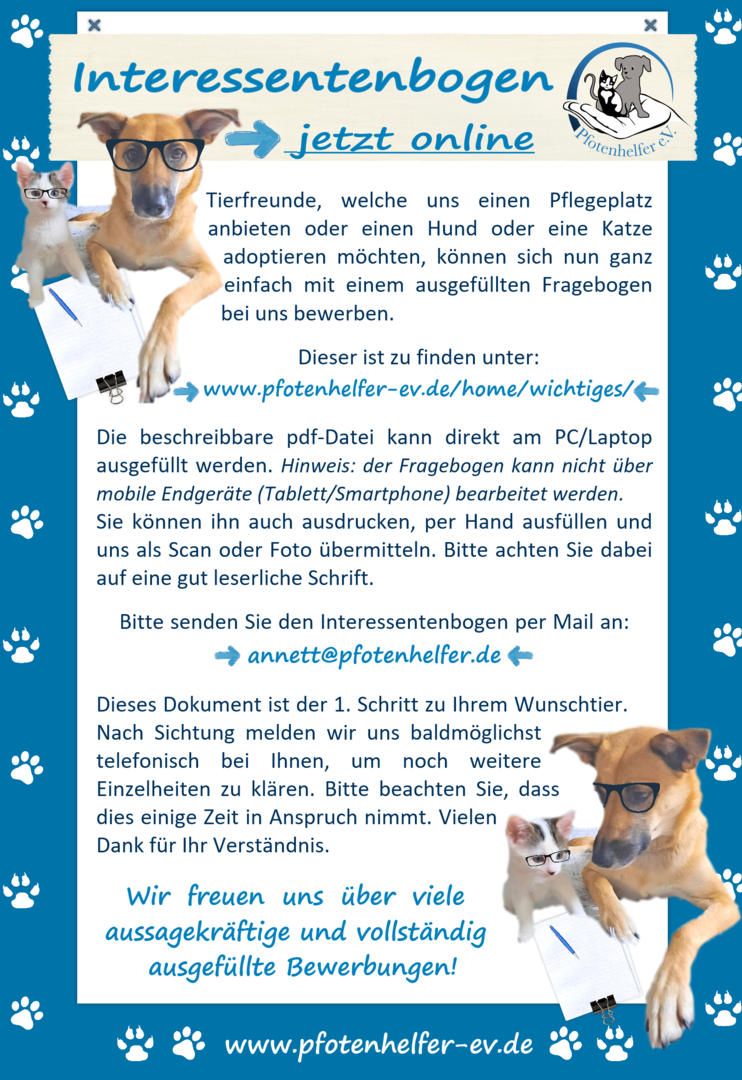Wenn ihr euch für ein Tier interessiert, füllt bitte das passende Interessentenprofil aus und schickt es uns zu.