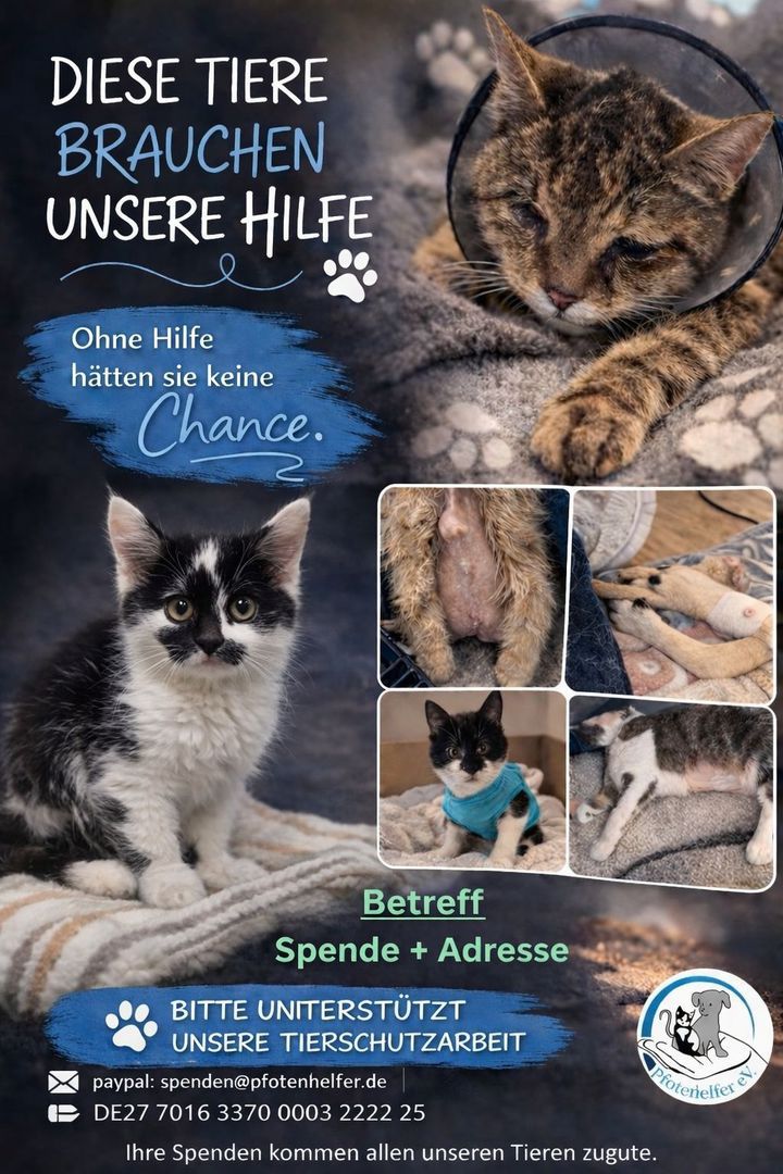 Behandlungen. Um auch weiterhin den vielen Notfellchen helfen zu können brauchen wir dringend finanzielle Unterstützung. Ohne Geldspenden geht es leider nicht.