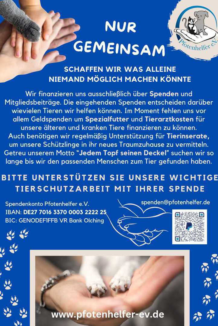 Als gemeinnütziger Verein finanzieren wir uns ausschließlich über Spenden und Mitgliedsbeiträge. Um die monatlichen Kosten für unsere Vierbeiner stemmen zu können sind wir insbesondere auf regelmäßige Spenden angewiesen. Schon ab einem Beitrag von 10 Euro monatlich helfen Sie uns enorm.