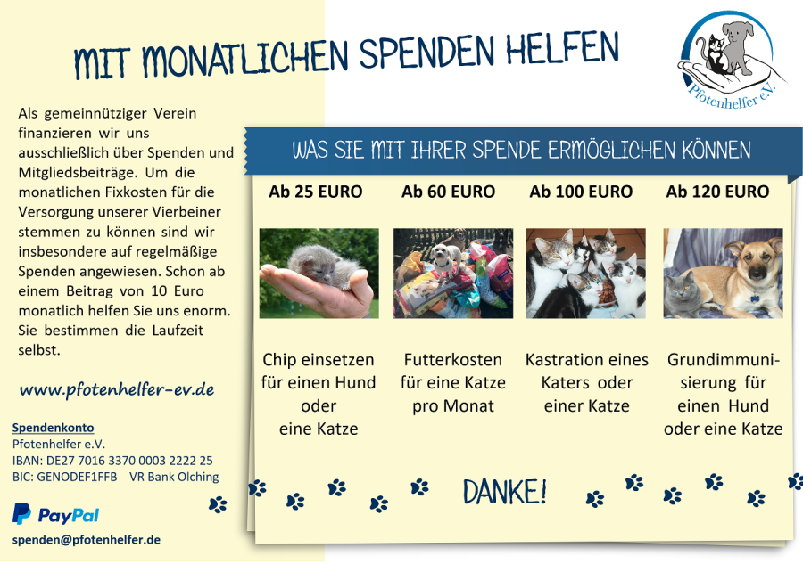 Als gemeinnütziger Verein finanzieren wir uns ausschließlich über Spenden und Mitgliedsbeiträge. Um die monatlichen Fixkosten für die Versorgung unserer Vierbeiner stemmen zu können sind wir insbesondere auf regelmäßige Spenden angewiesen. Schon ab einem Beitrag von 10 Euro monatlich helfen Sie uns enorm. Sie bestimmen die Laufzeit selbst.