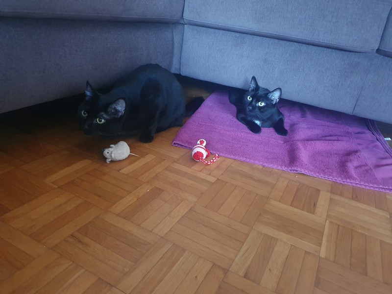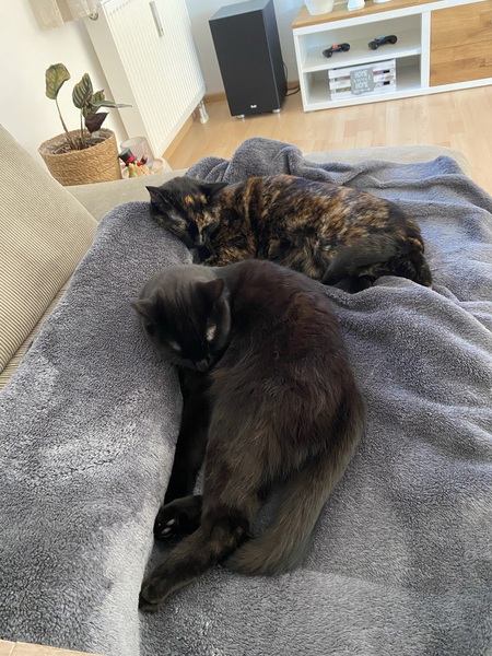 Also sind wir mehr als dankbar, dass Duchess von den Pfotenhelfern bei uns einzog. Die 8-monate junge Dame hat unseren alten Senior direkt von Stunde 1 verzaubert und die beiden mögen sich seither mit jedem Tag ein bisschen mehr. Sie ist unglaublich lieb, sozial, mutig und freundlich. Für uns ein wahrer Glückstreffer. Unser alter Kater schreit nicht mehr frustriert rum, sondern spielt schnurrend mit ihr. Er zeigt ihr alles, was es zu zeigen gibt - ja, auch den Quatsch, mit dem er uns gern nervt, gibt er selbstlos und altersweise an Duchess weiter ... ab und an wird auch schon übers Köpfchen geleckt.