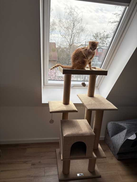 Meinen neuen Kratzbaum mag ich sehr gerne, von dort aus kann ich aus dem Fenster schauen und das Vorgehen im Garten beobachten. Den für mich sicher vernetzten Balkon durfte ich auch schon erkunden und habe mich dort in die Sonne gelegt um mich zu wärmen.