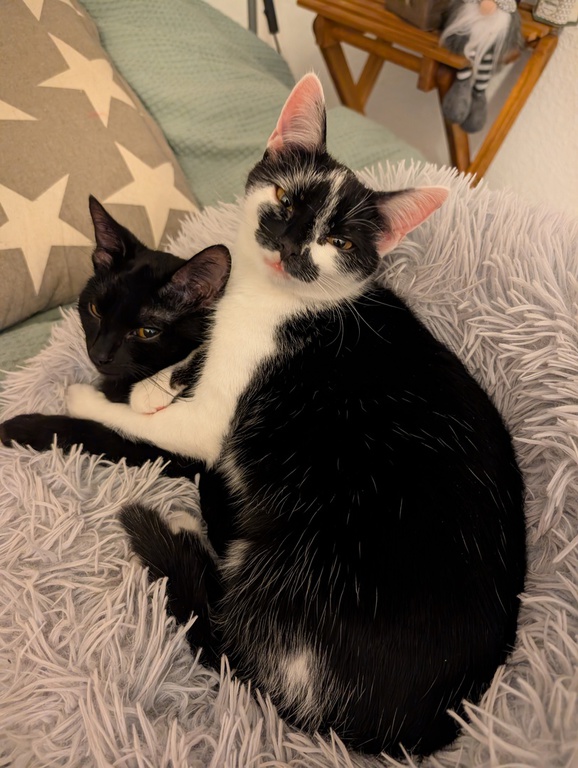 Anfang August 2025 kamen die Brüder Simba und Timon zu uns nach Hause. Ich wollte schon lange wieder Katzen haben, und als dies endlich möglich war, haben mir Bekannte die Pfotenhelfer empfohlen, um mir diesen Wunsch zu erfüllen. Die ersten Bilder, die mir geschickt wurden, waren direkt von meinen beiden Katern, die ich kurze Zeit später auch persönlich kennenlernen durfte. Als ich sie schließlich mit nach Hause nehmen konnte, war ich überglücklich und zugleich sehr aufgeregt. Simba, der rote Kater (2 Jahre), war von Anfang an sehr neugierig und hatte kaum Angst vor der neuen Umgebung. Timon, der schwarz-weiße Kater (1 Jahr), war dagegen sehr ängstlich und vorsichtig und hat sich zunächst lange unter der Couch versteckt. Nach ein paar Wochen wurde aber auch er entspannter und lief seinem Bruder immer häufiger hinterher. Inzwischen leben die beiden seit acht Monaten bei mir, und ich kann nur sagen, dass mein Zuhause durch sie viel schöner geworden ist. Simba ist der kleine Chef, der uns zeigt, wo es langgeht, und immer genau beobachtet, was wir machen, damit er nichts verpasst. Natürlich holt er sich auch regelmäßig seine Streicheleinheiten ab dabei wird gerne mal frech mit der Hand gespielt. Timon ist immer noch unser kleiner, schüchterner Kater, der aber schon viel offener geworden ist. Er schaut immer, wo wir sind, und lässt sich inzwischen auch streicheln. Am liebsten mag er es, wenn man ihn am Schwanzansatz krault dann fällt er regelrecht um und genießt es, wenn man ihm ganz fest den Kopf streichelt. Wenn er auf dem Teppich liegt und sieht, dass ich vorbeigehe, lässt er sich oft demonstrativ fallen dann ist Streicheln hinter den Ohren Pflicht. Die beiden sind zu einem großen Teil meines Lebens geworden, und ich kann sie mir gar nicht mehr wegdenken.