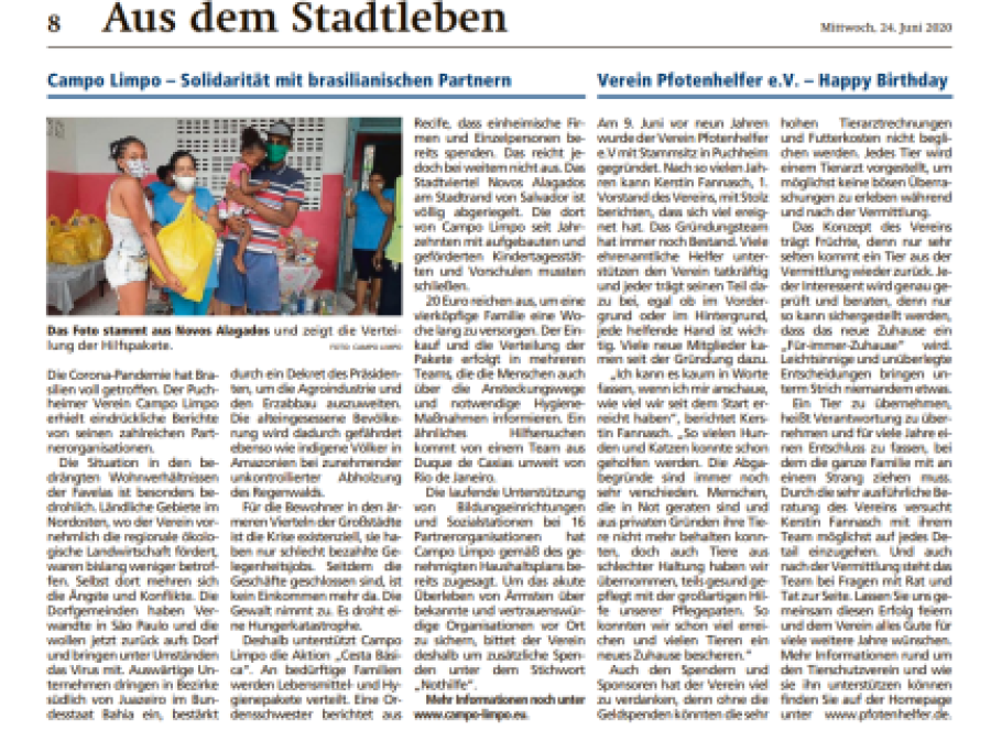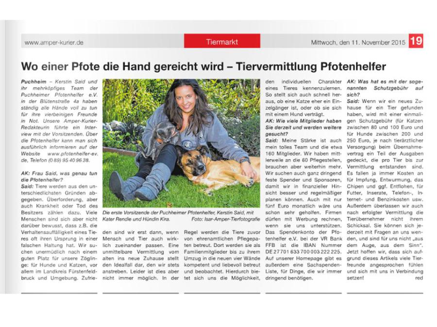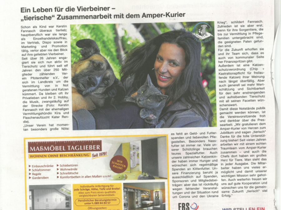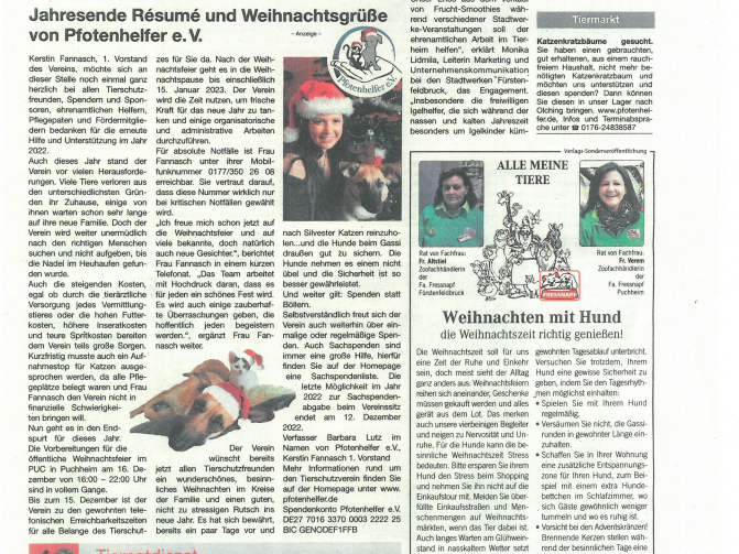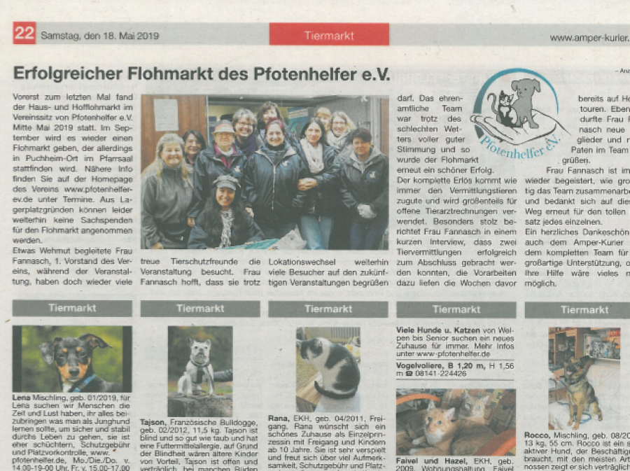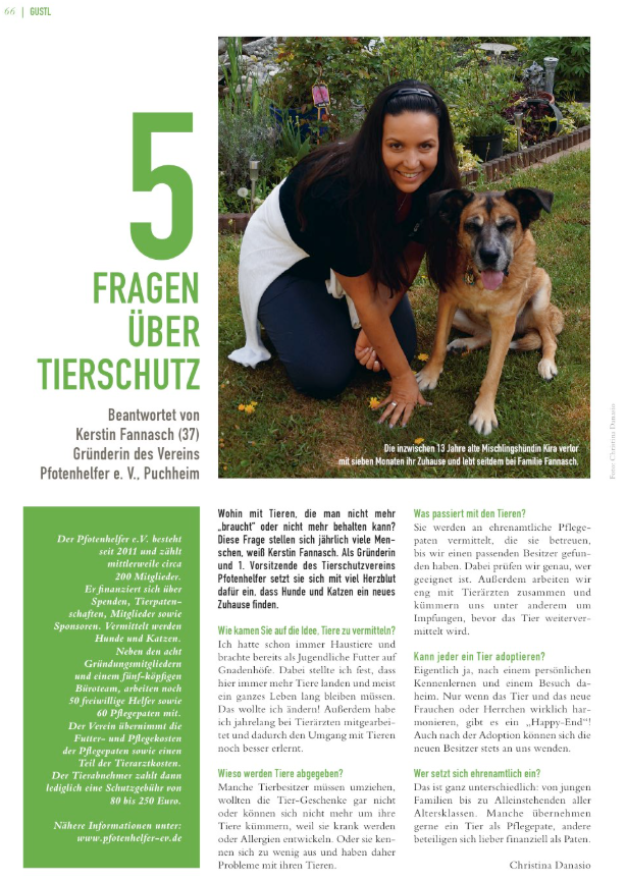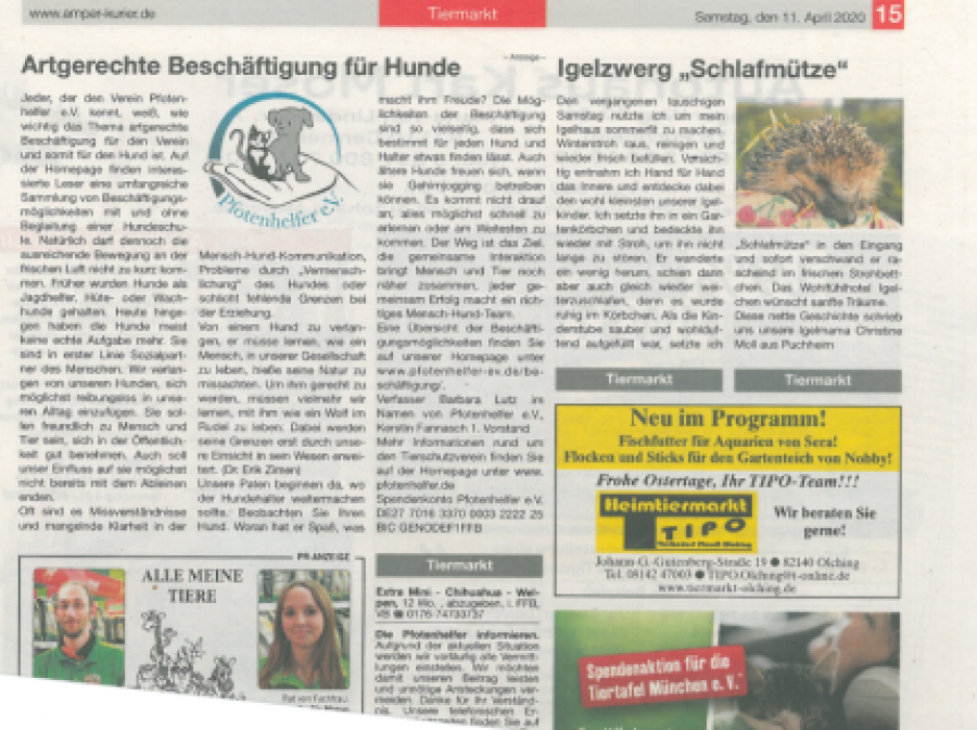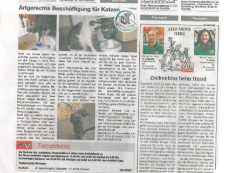Hier finden Sie verschiedene Artikel, die Pfotenhelfer e.V. online oder in gedruckten Exemplaren vorstellen. Auch wird über die Arbeit des Vereins berichtet oder aktuelle Themen, die den Verein beschäftigen.