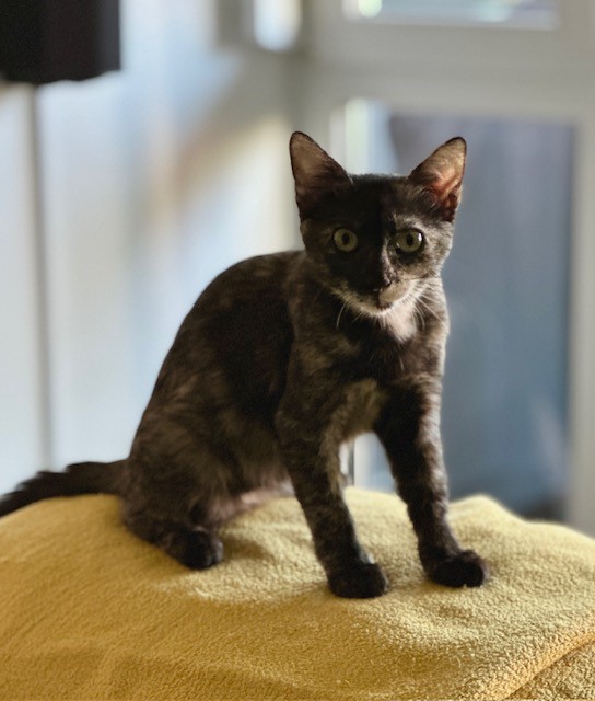 Dina (Dunkel-Schildpatt) ist eine verspielte, verschmuste, offenherzige Jungkatze. Sie ist jedem Menschen sehr zugeneigt und fordert aktiv geschmust zu werden und Nähe. Sie ist viel beim Menschen unterwegs, springt gerne auf den Schoss oder Schulter und fordert Aufmerksamkeit. Wenn sie in den Freigang geht, sollte sichergestellt sein, dass sie nicht zu offenherzig auf Fremde zugeht.