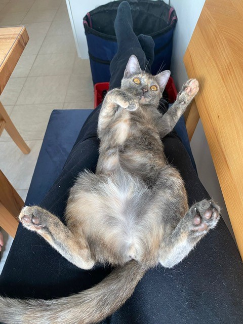 Dschini (Grau-Schildpatt) ist eine sehr verspielte, verschmuste, aktive und offene Jungkatze. Sie schläft recht viel. Sie ist gerne in der Nähe von Menschen und lässt sich gerne kraulen. Bei fremden Menschen ist sie neugierig und interessiert.