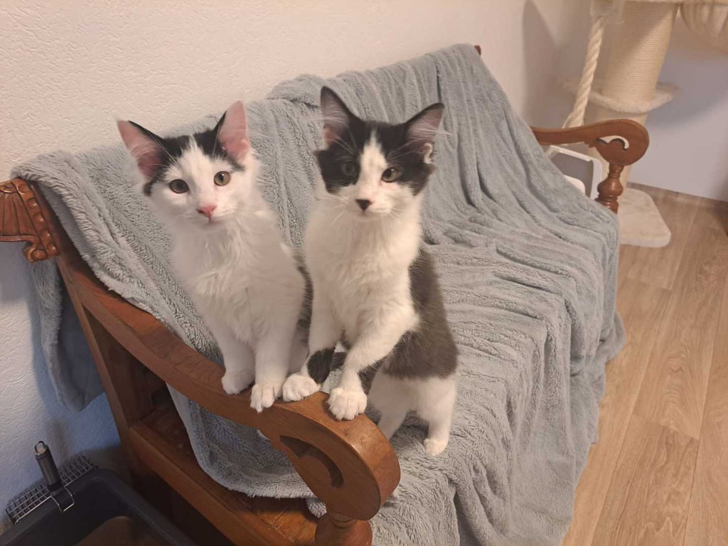 Die Geschwister sind aktive Katzenkinder, die am liebsten zu zweit ihr neues Zuhause suchen. Sie würden aber auch zu einer altersähnlichen und verträglichen Katzen umziehen.