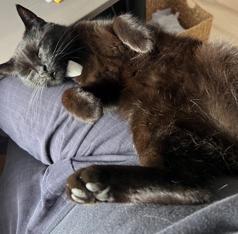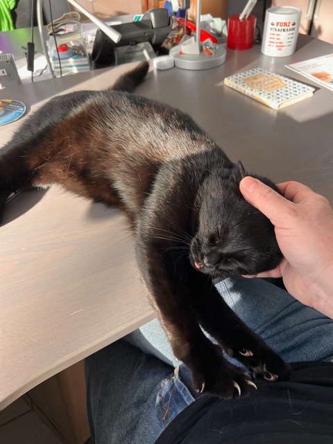 Ihren Lieblingsmenschen belohnt sie mit sehr viel Liebe und „redet“ viel mit ihm. Sie kommt gerne auf die Decke ihrer Lieblingsmenschen und lässt sich ausgiebig kraulen - gerne legt sie sich auch auf den Rücken zum Bauchi kraulen.