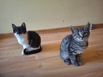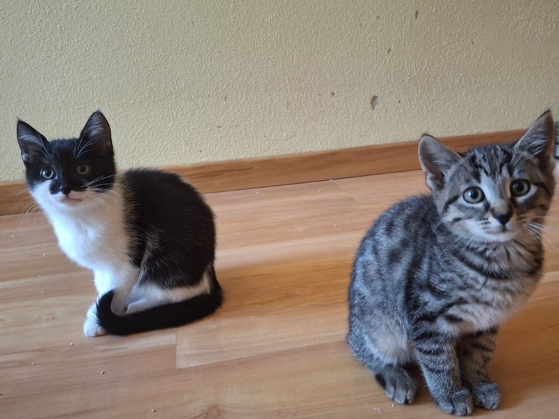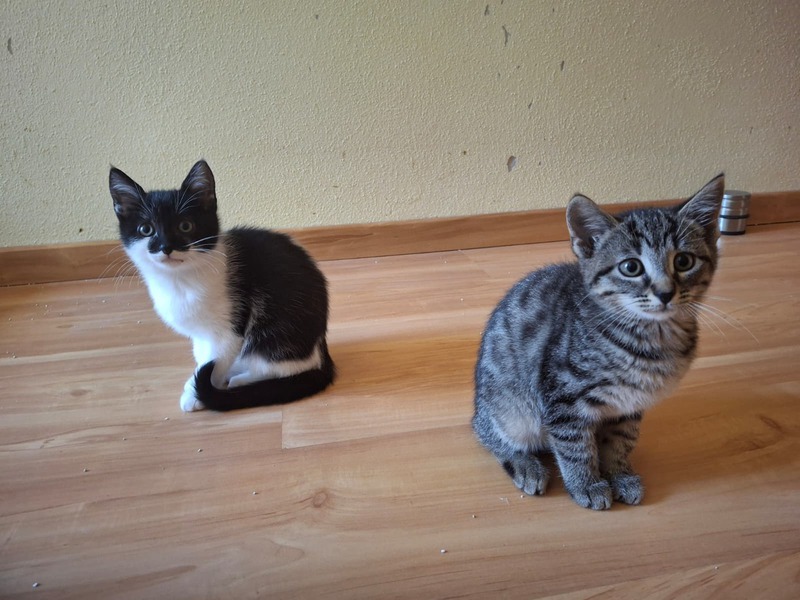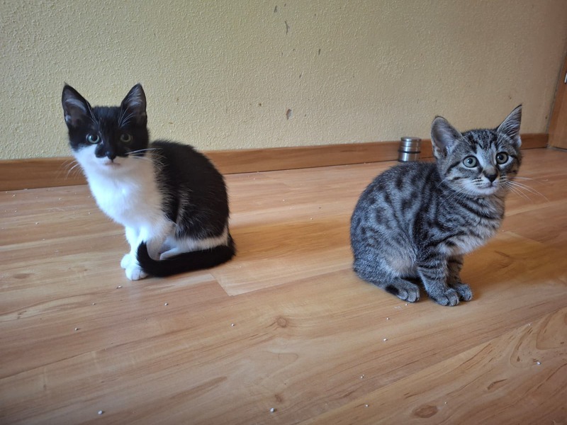 Das Geschwisterpaar Mathilda (getigert) und Mikada (schwarz-weiß) suchen gemeinsam ihr Glück.