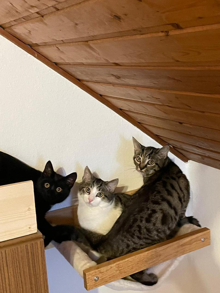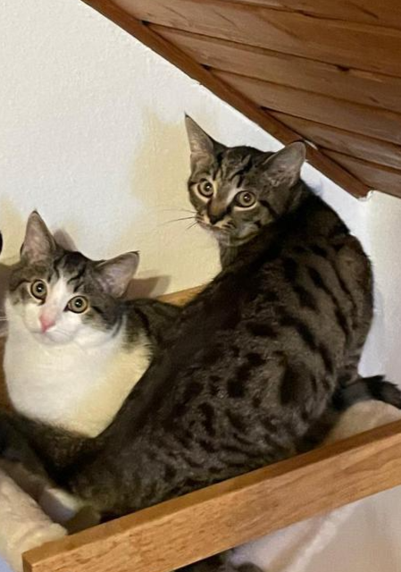 Die Geschwister Momo und Muffasa sind aktive und offene Katzenkinder, die zu zweit ein gemeinsames Zuhause suchen (oder zu einer bereits vorhandenen gleichaltrigen Katze). Ihre Schwester (schwarzes Fell) ist bereits in ein neues Zuhause gezogen.
